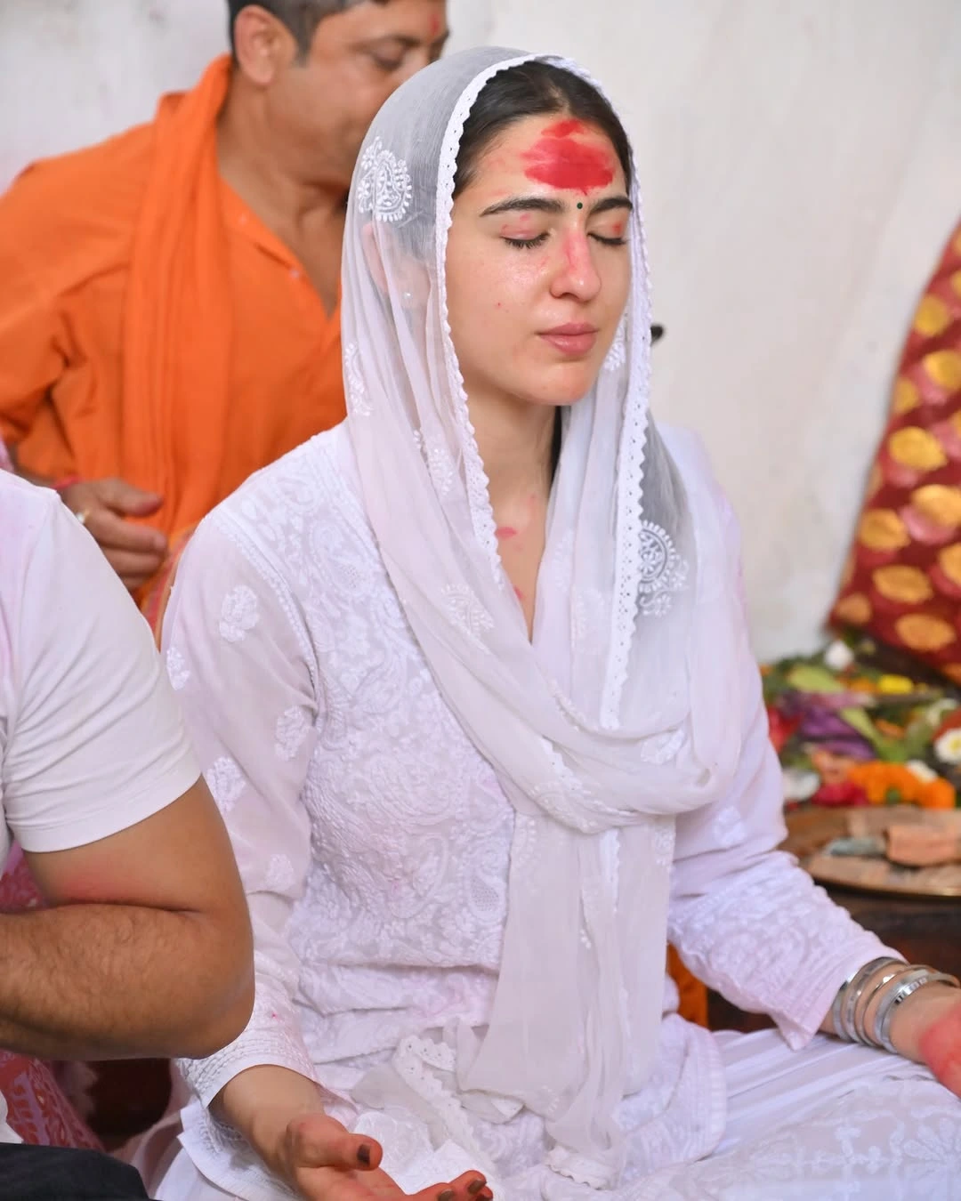 सफेद सूट में सारा अली खान देवी मां के दर्शन के लिए पहुंचीं। श्रद्धा और भक्ति में लीन नजर आ रही हैं। चेहरा निखरा हुआ और माथे पर सिंदूर।